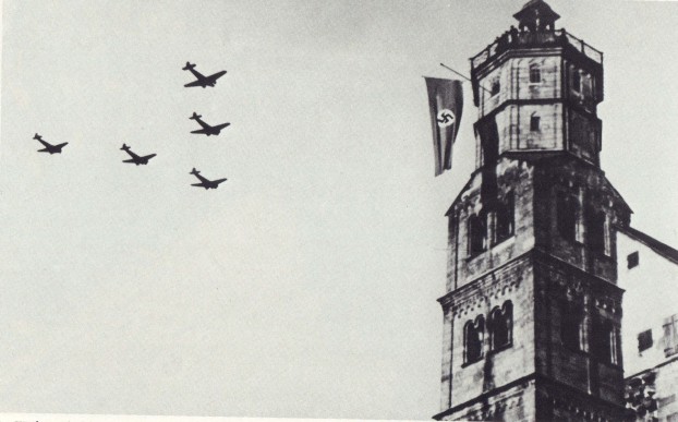 Hakenkreuzfahne am Turm von St. Michael (Stadtarchiv SHA)